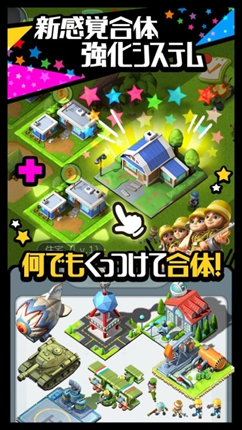 本作は『合体強化システム』を搭載。大量の兵士や施設が一瞬で合体する様子は、強化とは思えない爽快感が味わえる!どんどん合体させてどんどん強化させよう!