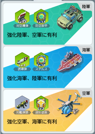 戦力の要となる部隊は「陸・空・海」の3種類に分かれている。陸は空に強く、空は海、海は陸に強いという三つ巴のような関係になっているので、敵の編成に応じて常に有利が取れるような編成を目指そう!