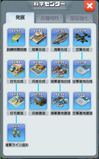 各種施設や兵器などは科学センターにてレベルを上げることでレベル上限を上げることができる。強化には欠かせない重要なシステムなので、どんどん科学を発展させて強化させよう。
